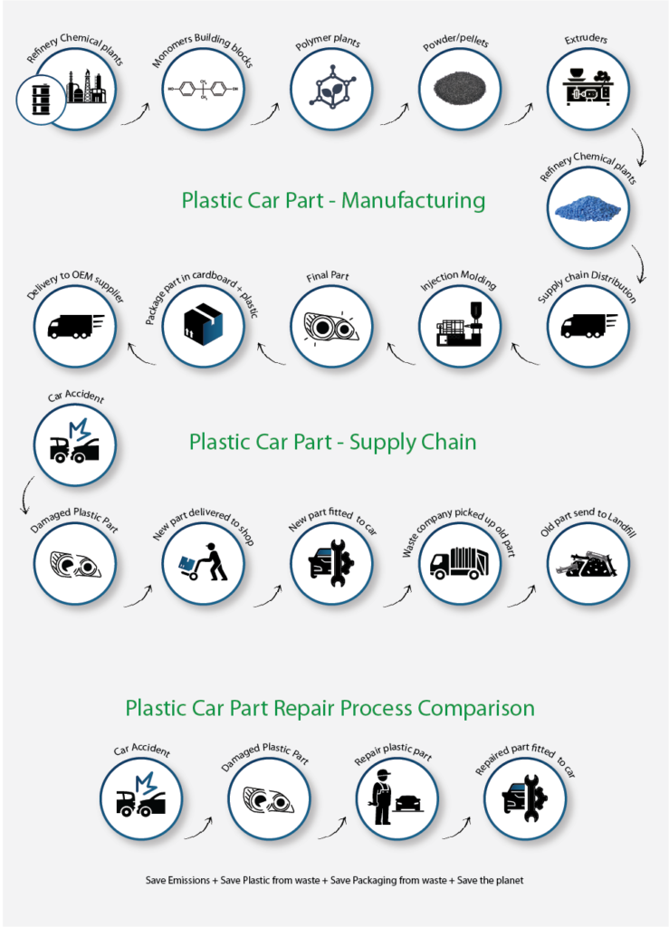 At 4Plastic we are passionate about the environment and reducing the volume of automotive plastic waste our partners send to landfill. The recent global push for businesses to be more sustainable, better manage their parts waste, and increase their reuse ratio has intensified. 4Plastic allows our partners to contribute to the environment by reusing more plastic parts through our advanced plastic repair processes and specialty tools.